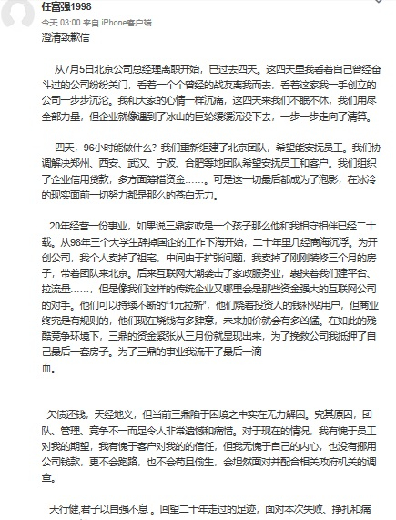 任富强在致歉信中称,三鼎家政的资金紧张从今年3月就显现出来,为挽救公司他抵押了自己的最后一套房产。对于目前的欠员工工资、用户退款难的问题,他表示欠债还钱,天经地义,但当前三鼎陷于困境之中实在无力解困。究其原因,团队、管理、竞争不一而足,令人非常遗憾和痛惜。对于现在的情况,他有愧于员工对他的期望,有愧于客户对他的信任,但无愧于自己的内心,“我没有挪用公司钱款,更不会跑路,也不会苟且偷生,会坦然面对并配合相关政府机关的调查”。他表示,面对此次事件,会认真反省,期待三鼎能够重生归来。