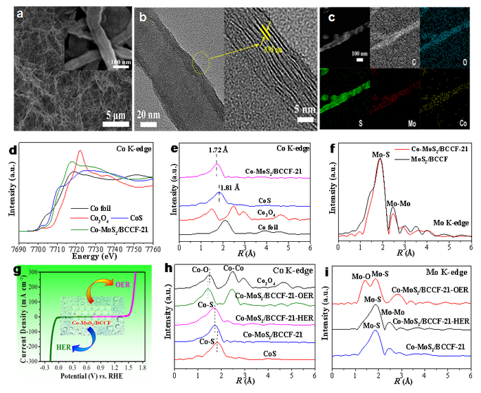 为此,研究人员发明了一种共价掺杂方法,通过钴的掺杂来诱导二硫化钼的全解水性能,在优化钴的掺杂比例基础上,获得了性能优异的二硫化钼基Co-MoS2/BCCF-21(BCCF:细菌纤维素热解衍生的碳纤维)双功能电催化剂。结果表明:这种双功能电催化剂在1.0 M KOH中分别具有-0.02和1.45 V的HER和OER起始电位。值得一提的是,最优Co-MoS2/BCCF-21催化剂能够分别在48、132、165 mV和260、350、390 mV的低HER和OER超电势下提供10、100和200 mA cm-2的高电流密度。将这种具有优异双功能催化活性的电催化剂直接用作全分解水阳极和阴极,产生氢气和氧气的速率分别为9.1和4.5 μmol min-1,而且法拉第效率接近100%。