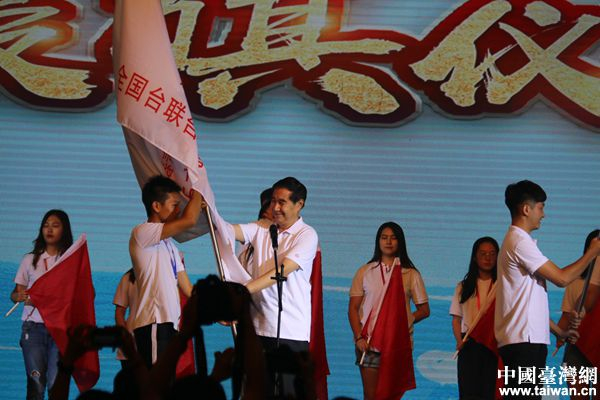 全国台联党组书记、会长黄志贤授夏令营总营旗。(全国台联 易靖茗 摄)