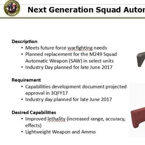 塞巴斯托的幻灯片演示确定了一些最重要的现代化需求:可以跨越所有平台的高压/低损耗武器技术;增程武器技术;弹头新材料;间接火力精确武器的电源;人工智能武器火力控制;先进的小口径弹药;摧毁无人机的武器弹药;用于枪支和炮架的轻型高强材料;在轻型有人驾驶和无人驾驶平台上帮助提高杀伤力的缓冲新技术。