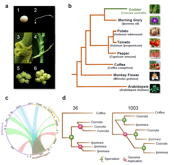 自然界绝大部分植物都通过叶片的光合作用和根部的水分和营养吸收维持自养生存,而寄生植物则是一类通过寄生在自养植物上获取能量和营养的植物。寄生植物独特的起源、演化和特殊生理生态长期以来吸引着研究者的目光。旋花科茎寄生植物菟丝子寄生行为在实验室中方便控制和观察,近年来已成为许多探索寄生植物生理生态和进化生物学的重要研究对象。为了解密菟丝子属植物的演化,同时也为以菟丝子为模型的寄生植物生理生态研究提供重要资源和基础,近日,中国科学院昆明植物研究所功能基因组学与利用团队吴建强研究组,以南方菟丝子(Cuscuta australis)为对象(图1),通过全基因组和转录组测序,获得了首个寄生植物高质量参考基因组。研究组通过比较基因组学、分子进化等分析获得了大量信息,为了解寄生植物的演化、寄生植物与寄主间的互作提供了重要基础。