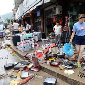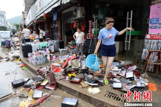 中新网7月12日电(记者 林春茵 叶茂 吕巧琴)11日18时,福建省宁德市霞浦县牙城镇牙龙路上一片狼籍。巷口的墙上,湿漉漉的水渍印高有1米多,恰好是这一排商铺里三层货架的高度。“卷帘铁闸关着也没用,三层货架上的鞋子,全泡水里了。”路口鞋店老板刘峰木着脸说。