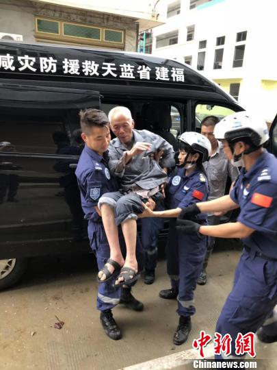 图为福建省蓝天救援防灾救灾中心队员安全转移偏瘫老人。蓝天摄