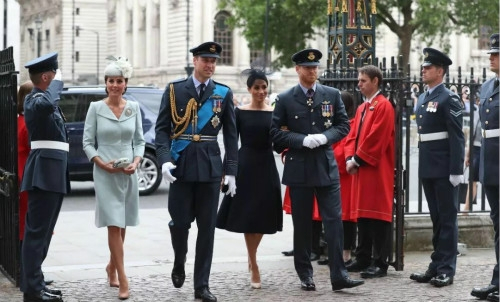 飞行编队途径白金汉宫。女王带着王室一大家子站在阳台上观礼,连还在休产假的凯特王妃都来了。不过和6月女王生日阅兵不同,这次竟然是梅根站到了女王奶奶身边的C位,和卡米拉平起平坐,凯特和威廉靠边了。