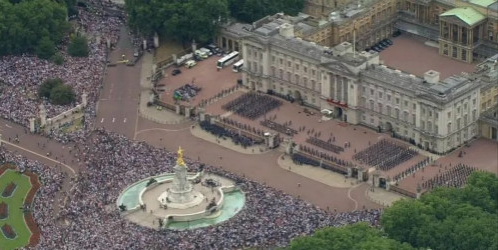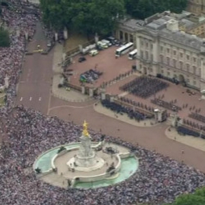 伦敦市民和游客都挤上街头,从白金汉宫门口、到著名的林荫道The Mall、再到林荫道尽头的特拉法加广场,据说现场估计有几万人同时观礼。