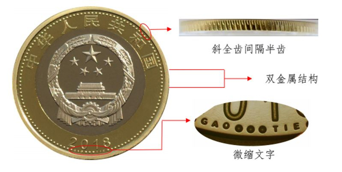 高铁币外环为黄色铜合金,内芯为具有独特机读性能的镍带复合白铜材料。