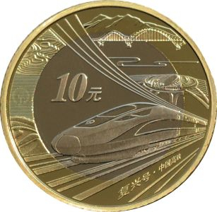 将高铁币倾斜适当角度,可在背面左侧外环的局部区域,观察到中国铁路标志图案“