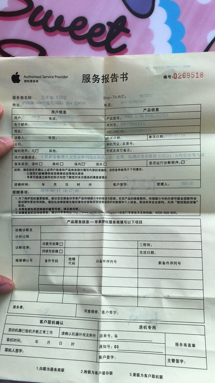 6月17日,石先生将手机送到苹果指定售后点——嘉开瑞上海店进行维修。苹果官方客服向澎湃新闻证实,该售后点是苹果官方授权服务商。
