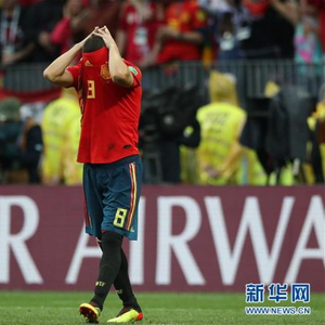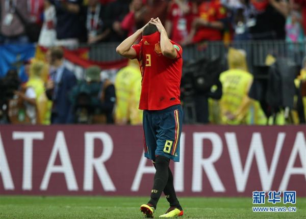 7月1日,西班牙队球员科克在点球大战中罚失点球后用球衣掩面。当日,在莫斯科进行的2018俄罗斯世界杯足球赛八分之一决赛中,西班牙队与俄罗斯队在120分钟内战成1比1平。经过点球大战,西班牙队以总比分4比5不敌俄罗斯队,无缘八强。新华社记者吴壮摄
