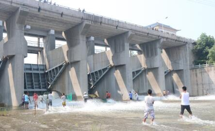 记者看到,在蓄水闸西侧的出水口处,有七八名男子卷着裤腿逆着水流站在水中,有的拿着渔网,有的拿着水桶,都在等着捞鱼。