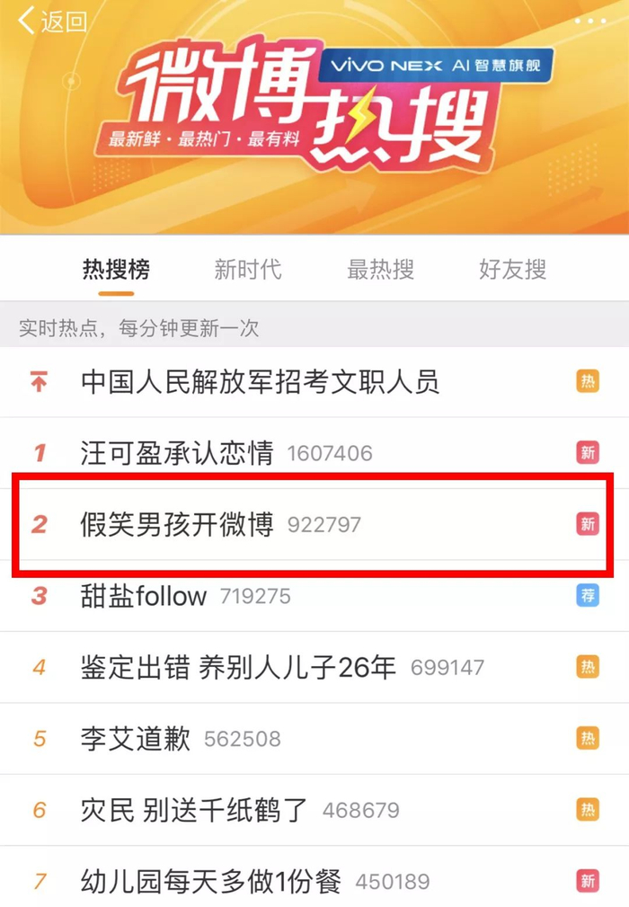 是不是一下子就眼熟了,今天“假笑男孩”开了微博,一下子上了热搜,