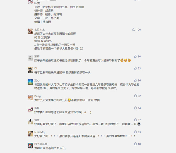 对于今年这份“走心”的豪华大礼盒,不少该校新生已经迫不及待,也有往届生和研究生表示羡慕不已,提议开出购买渠道。7月中下旬,今年这份 “信念种子”录取通知书预计将陆续发放到各个北林“新绿”手中。
