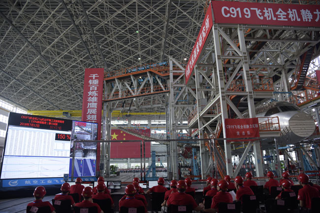 2018年7月12日,在中国民用航空局(CAAC)、欧洲航空安全局(EASA)代表目击下,C919大型客机顺利完成全机2.5g机动平衡工况极限载荷静力试验,结构变形和应变符合分析预期,机体结构满足承载要求,试验取得圆满成功。