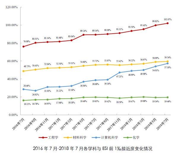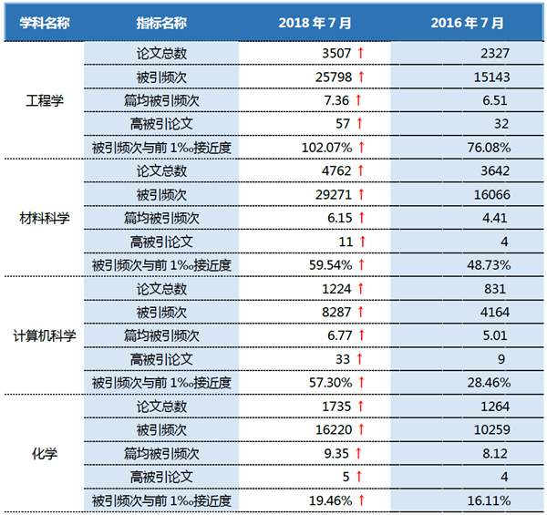 近两年来,我校4个进入ESI前1%学科的主要指标均呈上升趋势,除工程学排名已进入前1‰外,材料科学、计算机科学、化学被引频次与前1‰学科差距均进一步缩小。