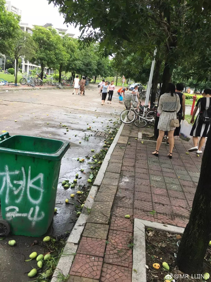 台风“玛莉亚”所到之处如蝗虫过境。福州300多棵绿化芒果树被暴雨袭击,上千斤芒果散落一地。