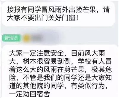 对于冒风雨“拯救”芒果的行为,学校老师也多次提醒学生不要外出,关好门窗待在寝室内。遇到不听劝的,拦住他!