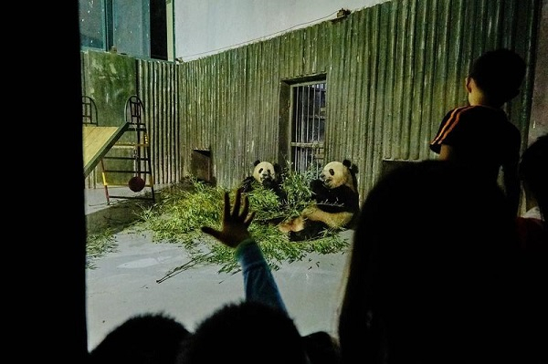 首站告捷后,老师还带队拜访了狒狒、蝙蝠、猫头鹰、老虎、狮子、大熊猫、鹈鹕、天鹅等。和白天相比,一些动物如大熊猫、棕熊正在睡觉,小朋友们可以观察睡姿,一些动物如蝙蝠、猫头鹰、夜鹭正是活动时间,小朋友可以观察它们的夜间行为,如猫头鹰的脑袋可以旋转270度;有些动物习惯白天蛰伏、晚上出来活动的,如狮子、老虎、狼,可以观测到夜间它们的眼睛因为聚光效果,发出了淡淡的亮色。偶尔它们还会仰天长啸几声,小朋友们颇感新奇,还模仿着一起叫。