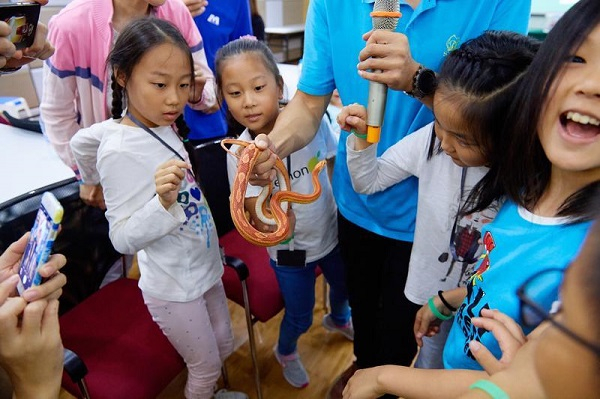 图说:“动物全接触”环节,小朋友近距离观察玉米蛇 上海动物园供图