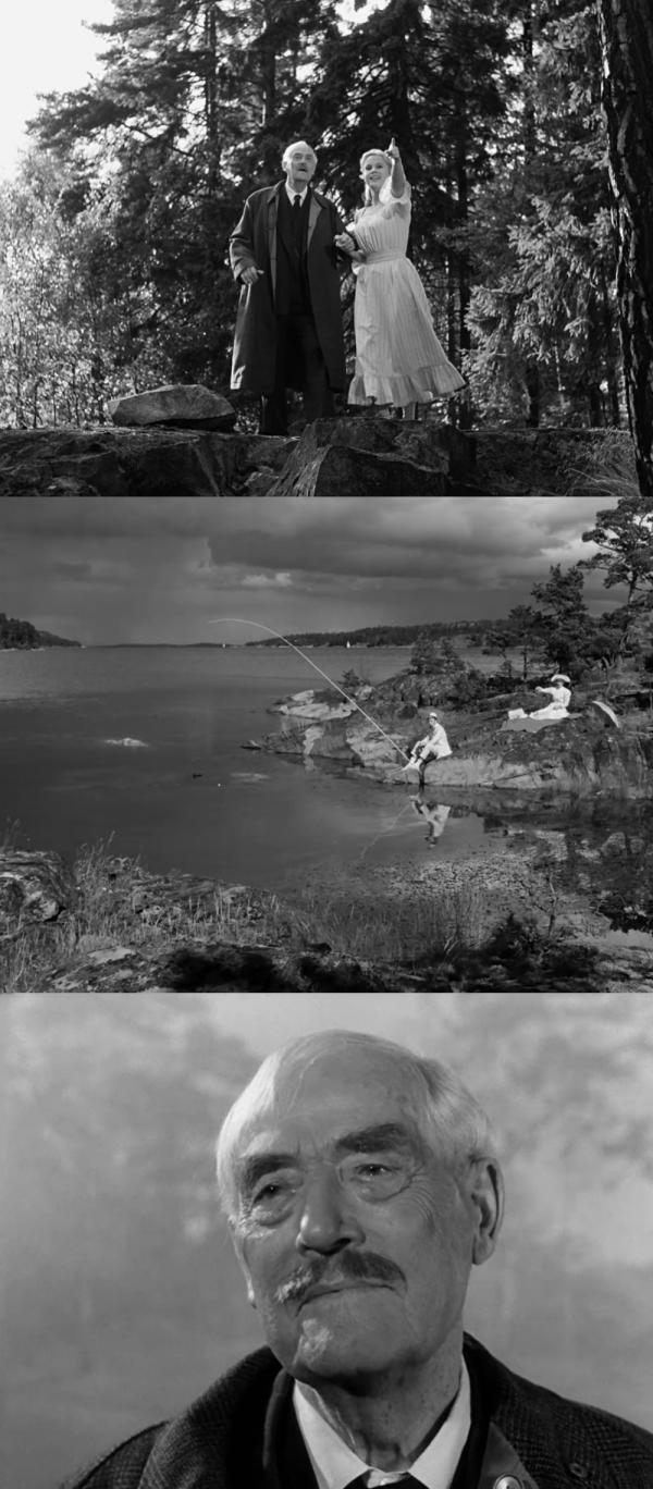 与此同时,伯格曼虽然持续无情解剖婚姻与家庭,但内心深处也一直藏着亲情与爱情的温暖画面。《野草莓》中老医生的最后梦境,找不到父母的他在初恋情人的引领下,穿过沐浴阳光的树林,看到正在远处的湖边垂钓的父母,他们微笑着向他招手的动作,尽管隔着距离却清晰可辨,让他流下动情的眼泪。而他虽在少不更事时情场失意,却也收获忠实的伴侣陪他走完人生的全程。