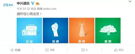 7月14日早间,中兴通讯官方微博发文称:满怀信心再出发。