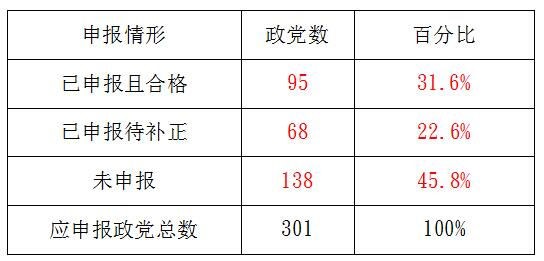 尚有68个政党资料仍待补正,138个政党尚未办理申报,应于2019年1月15日前补正。此外,截至6月底,共有95个政党无法取得联系。