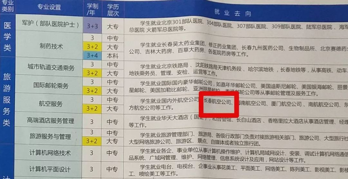 “旅游服务”类下设“航空服务” 到“长春航空公司”就业?!