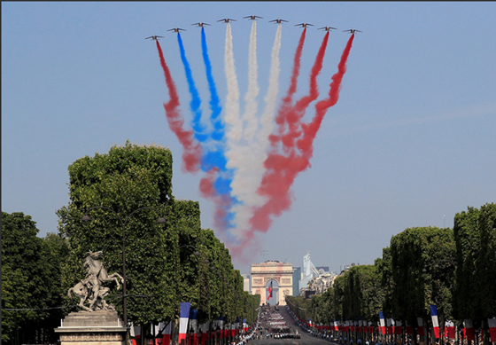 尴尬!法国庆阅兵式失误频频:摩托车队撞车 飞机喷错彩烟
