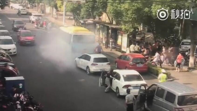 据苏州市交警支队官微消息,6月11日下午四点多,正值学校放学高峰期,苏州市吴江区盛泽镇东方路升明校区站台处,一辆公交车突然发生自燃,发动机底部冒出滚滚浓烟。