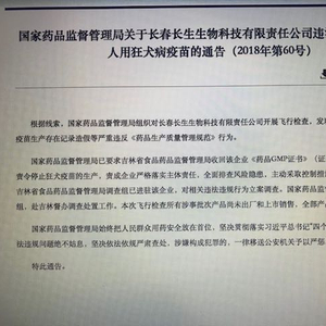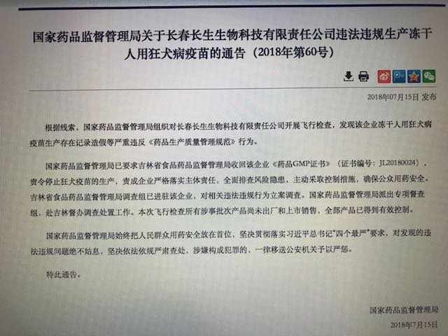 7月15日,国家药品监督管理局通告:近日,国家药监局根据线索组织检查组对长春长生生产现场进行飞行检查。检查组发现,长春长生在冻干人用狂犬病疫苗生产过程中存在记录造假等严重违反《药品生产质量管理规范》(药品GMP)行为。