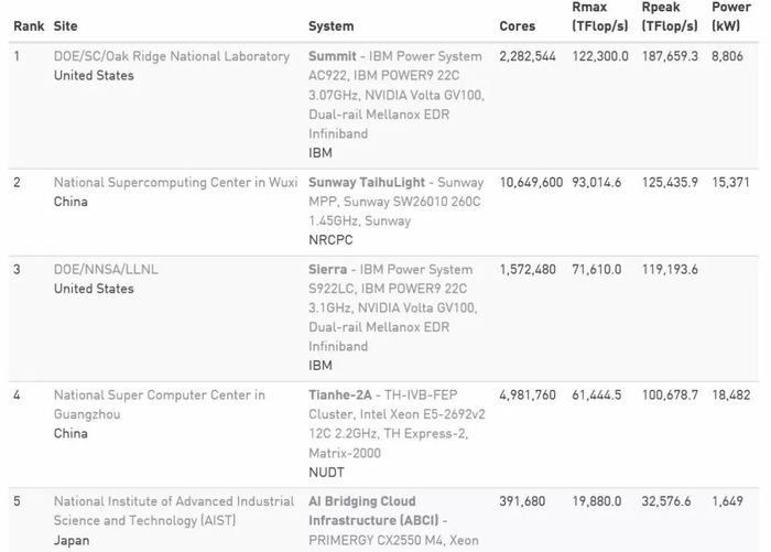 在学术界,有一个著名的超算500强排行榜,叫做TOP500,自从1993年6月创办以来,每半年发布一次。2018年6月25日,TOP500榜单更新了,Summit如愿登顶。这件事引起了很多人的关注,因为这是5年以来,美国第一次重新夺回TOP500的第一名。从哪个国家的手里夺回的呢?你猜对了,就是中国!