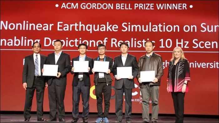 ▲清华大学地球系统科学系副教授付昊桓等共同领导的团队完成的“非线性地震模拟”获得2017年戈登·贝尔奖