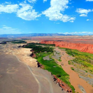 站在天山红河谷入口处的断崖边,可以清晰地看到远处的天山,天然的红土飘带,一簇簇的绿荫,坐落有致的农家院落。荒凉的戈壁与断崖下的美景,给人以强烈的视觉冲击。红色的山岩,犹如一条镶嵌在天际间的飘带而光彩夺目,河谷内宁静的村庄透露着几分神秘。