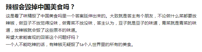 如今,中国的辣椒种植面积位居世界第一,辣椒食用人口和实际消费量也位居第一。不吃辣的人被挤到了墙角。他们瑟瑟发抖,好不容易提出了一个灵魂拷问: