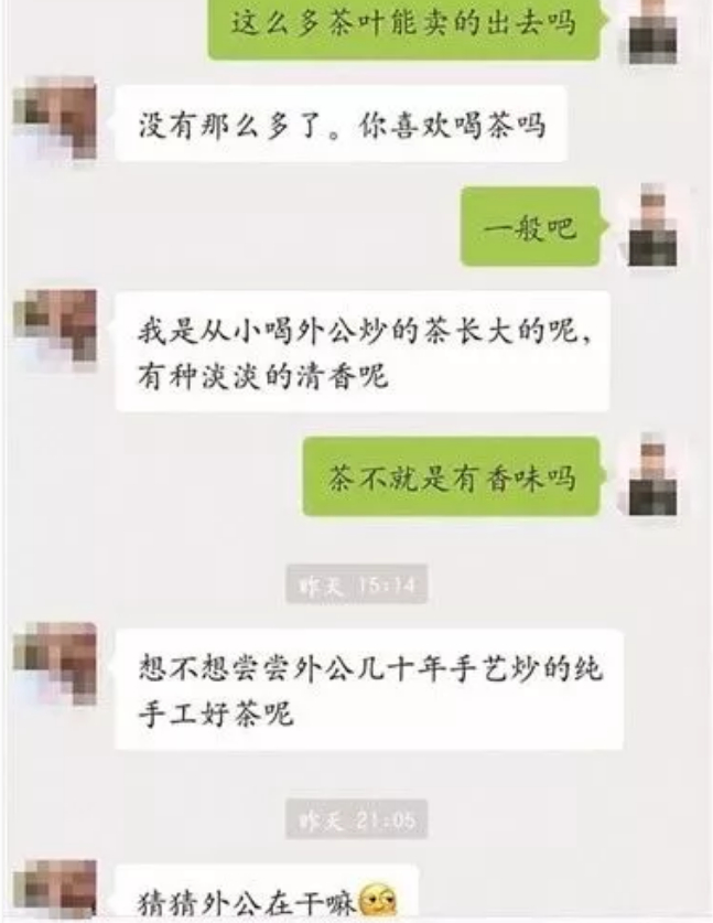 田天告诉记者:“她说和她外公打电话时感觉老人的状态不对,要回老家看看。”此后两人的聊天内容就集中在“外公”的话题上,诸如“带老人去检查身体、给老人洗脚以及讲述老人生活多么多么辛苦之类的。”不久,“苏苏”顺势提起,老人是种茶的,并开始向田天推销茶叶。
