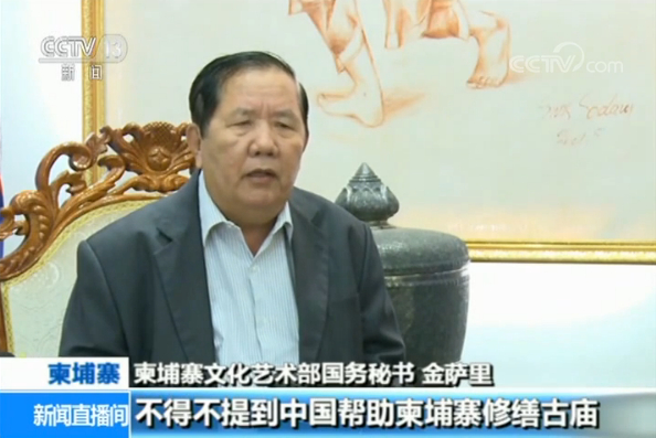 金萨里:关于文化方面的合作,不得不提到中国帮助柬埔寨修缮古庙,我们的古迹神庙,不好好修复的话,久而久之它就会坍塌荒废,一旦荒废了我们再进行修复难度很大,中方对周萨神庙及时进行了修复工作,这是一件非常好的事。