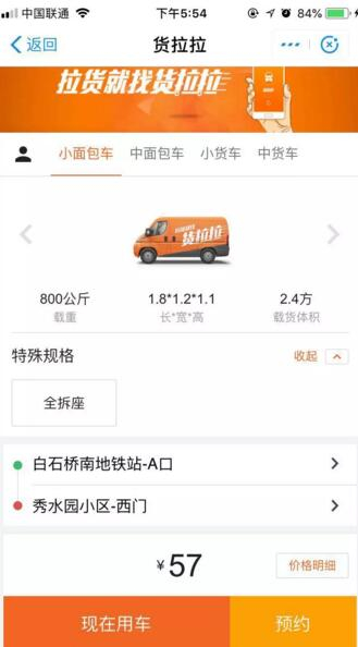 “我想起来,曾用过‘货拉拉’软件约车搬家,当时是不用排队的。于是我就用‘货拉拉’APP预约了一辆面包车,车型是九座商务车。”他回忆,下单后很快有司机接单,10分钟左右就接到了他。“我告诉司机我没有货,司机也没说什么,载上我就走了。”