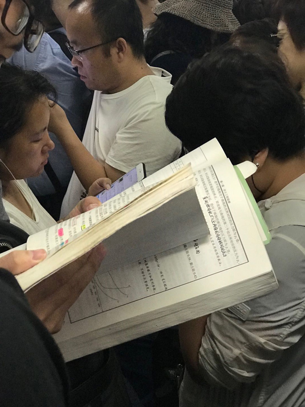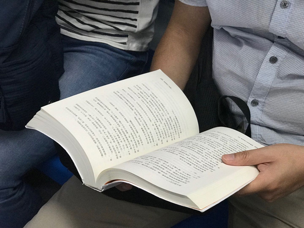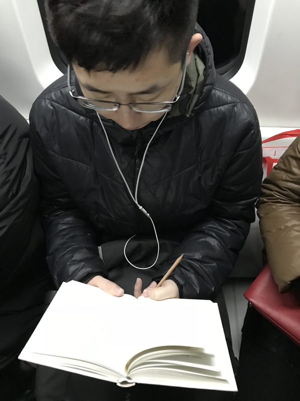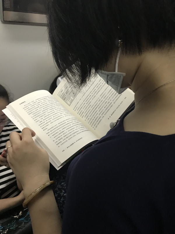 因为职场充电而读书的人也很容易分辨:那些辅导教材往往开本很大,又很厚,他们常常一边看一边做笔记。有一次遇到一位,即使在车厢广播已经报过站,车门打开前一秒,他仍然认真地在书本上写东西。那些备考注册会计师、注册岩土工程师的人,那些学习英语和法语的地铁一族,在候车时,在车厢里,在换乘电梯上,用专注的神情改变了我对这类读者“无趣”的刻板印象——努力当然值得称赞。