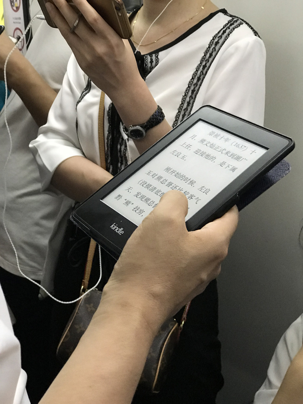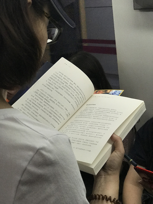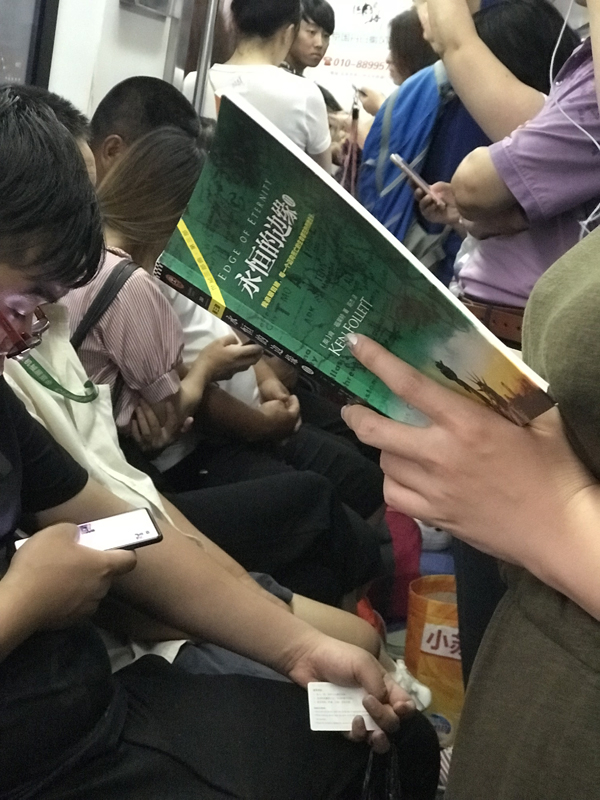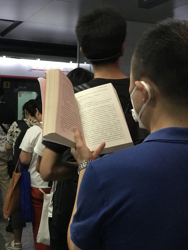 对阅读本身来说,除了读书的人,最值得关注的当然是书。而那些被带上地铁的书,也为我打开了一张书籍图谱。简体中文版自不必说,读竖版古籍和繁体台版者有,读外文书的外国人和读外文书的中国人有。读页面泛黄的旧书者有,读不足巴掌大的袖珍书者也有。给纸书包书皮的不分老少,给kindle套书衣的也不分男女——他们每一次打开书开始阅读时,心情都会很好吧。