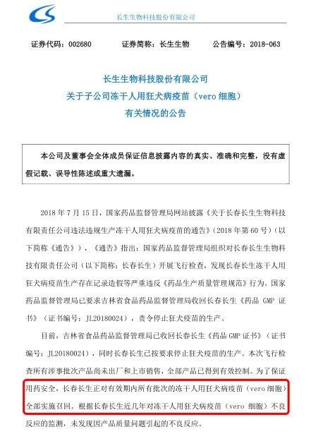 7月16日早间,长生生物发布公告称,长春长生对有效期内所有批次的冻干人用狂犬病疫苗全部实施召回。“长春长生对此次事件的发生深表歉意。长春长生将密切跟踪事件进展,积极配合国家药品监督管理局、吉林省食品药品监督管理局等相关监管部门开展后续工作,严格按照中国证监会、深圳证券交易所的相关规定履行信息披露义务。敬请广大投资者注意投资风险。”