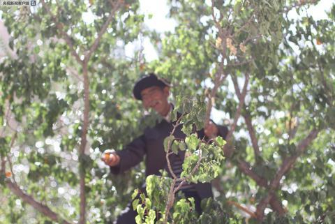 △艳阳下 皮勒村爷爷热情地爬上树摘杏子
