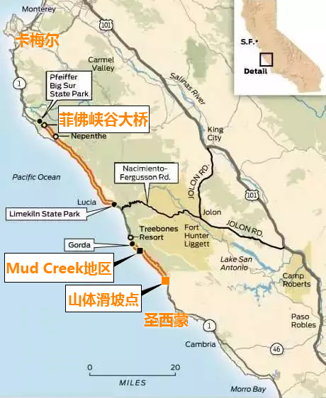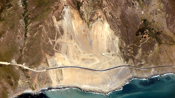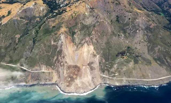 大瑟尔(Big Sur)是美国加州卡梅尔到圣西蒙之间的盘山海岸公路,蜿蜒的海岸公路和沿途优美的自然风光一直深受游客们的喜爱。2017年5月20日,大瑟尔南入口附近Mud Creek地区遭遇大规模山体滑坡,约500米的公路被超过100万吨砂石和泥巴掩埋。万幸的是,由于当时菲佛峡谷大桥因暴雨导致桥体开裂,该路段正处于关闭中,所以没有人员受伤。加州交通部随即关闭了所有进入该高速公路的路线。
