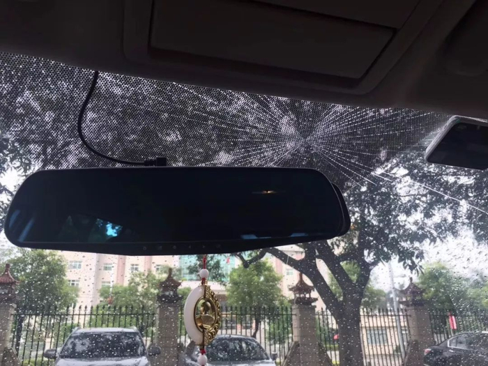 李先生介绍,他因工作需要开私家车到某政府单位开会,把车停在一棵芒果树下,会后出来发现原本完好无损的挡风玻璃裂开了。记者通过照片观察到,挡风玻璃裂纹呈放射状,受力点位于挡风玻璃中部靠上位置。