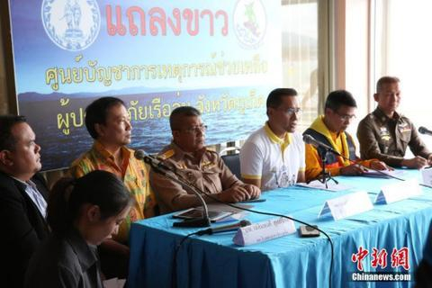 资料图:2108年7月8日傍晚,泰国旅游和体育部部长威拉萨(右三)在新闻发布会上说,已经打捞上来41名普吉翻船事故遇难者,其中包括13名儿童,另有15人仍失联。5日下午,普吉岛海域两艘游船发生翻船事故,两船共有127名中国游客。中新社记者 王国安 摄