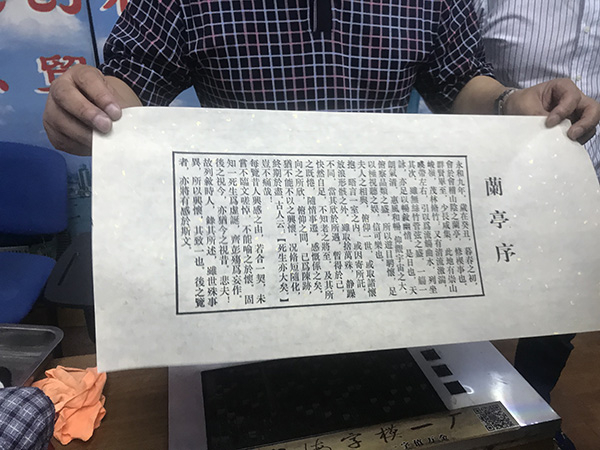 上海字模一厂副厂长刘现云演示拓印铅活字排版的《兰亭序》。