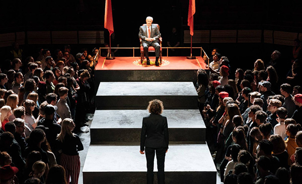 360度的舞台不断升降变化,演员时不时和观众擦肩而过,无不叫人欢欣雀跃。在NTLIVE的俯视镜头中,观众甚至可以清晰看到,舞台地板被划分成不同区域,在变化中体现观众(民众)与统治者的权力、地位变化。