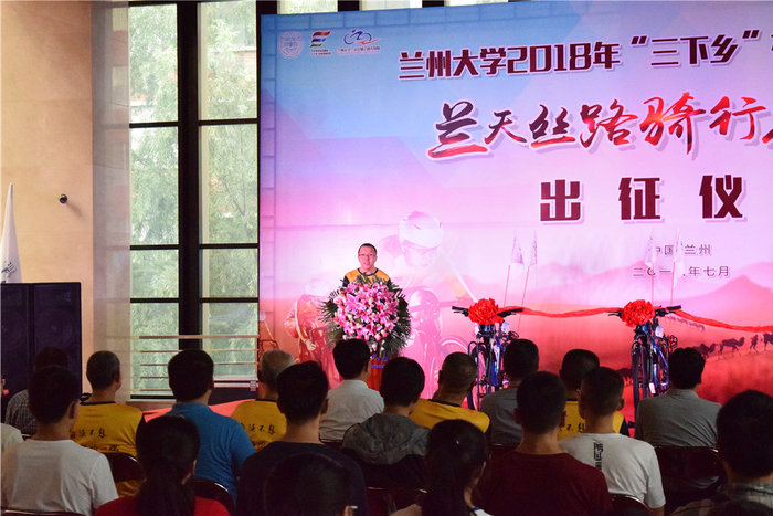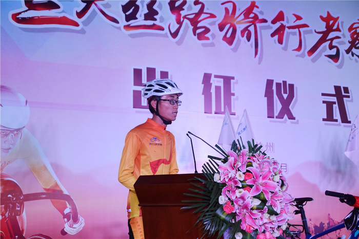 出征仪式上,兰州大学团委书记李华龙介绍了本次“兰天”丝路骑行活动概况。为纪念“兰天”丝路考察队出征35周年、迎接学校110周年校庆,兰州大学组织师生、校友50余人重组“兰天”丝路骑行队,将从兰州出发,沿丝绸之路甘肃段一路向西骑行至敦煌。活动为期15天,途经12个地市,骑行距离达1400余公里。