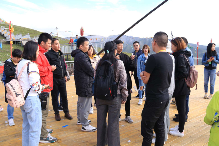 7月23日下午,参加“大美青海·梦幻察尔汗——2018全国重点网络媒体看青海”采访活动的40余家网媒编辑记者走进位于贵德县拉脊山山垭,海拔3820米处的宗喀拉则。