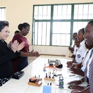在学校物理实验室内,初三学生正进行电路实验,通过并联、串联让灯光亮起,并陈述自己的感悟。彭丽媛不断对学生的表现给予鼓励。当听到一个学生说要用所学知识服务社区时,彭丽媛双手举起大拇指为她点赞,并表示希望卢旺达每一个女孩都通过努力学习,掌握本领,去带动一个社区、一个家庭。“你们还非常年轻,希望你们对未来充满希望。”
