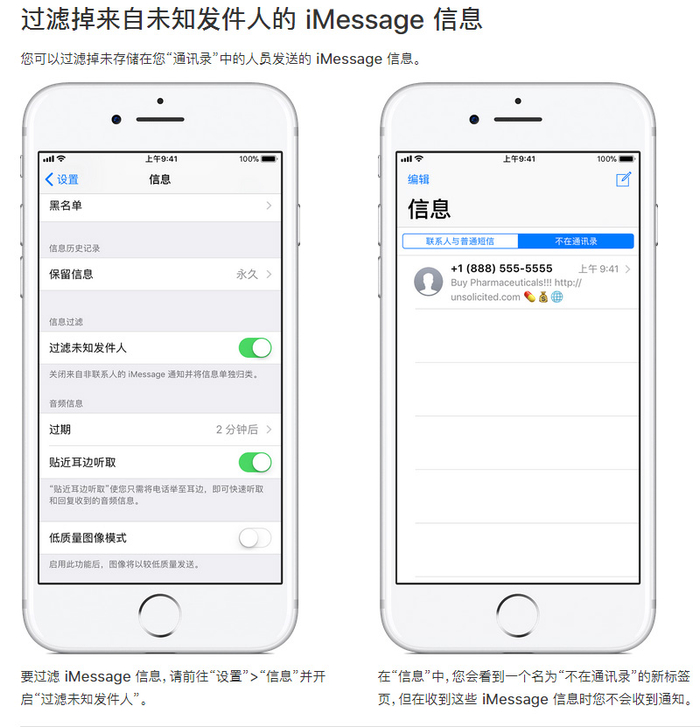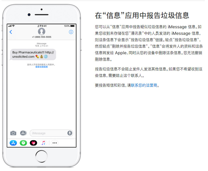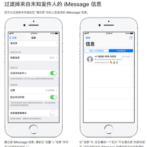 不过,对用户来说,为免受此类垃圾短信骚扰,可以有两种方式来解决。如果iMessage功能使用不多的人可以直接把该功能关闭,通过数据流量渠道的短信则不会再被接收到;其次,用户可以通过“设置-信息-过滤未知发件人”等设置来屏蔽,对已经发送垃圾短信的人向苹果举报并把他们拉入黑名单。
