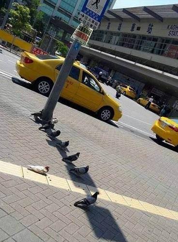 据台湾中时电子报7月25日报道,网友在脸书上发照片表示“这就是高雄的日常”,地点在高雄火车站,只见照片中有七只鸽子,全都排排站,躲在电线杆的阴影下休息,躲避烈日,只有一只白色的“边缘鸽”在路面上晒太阳。
